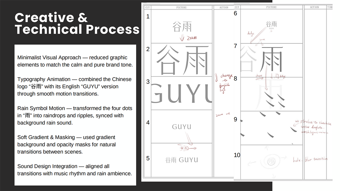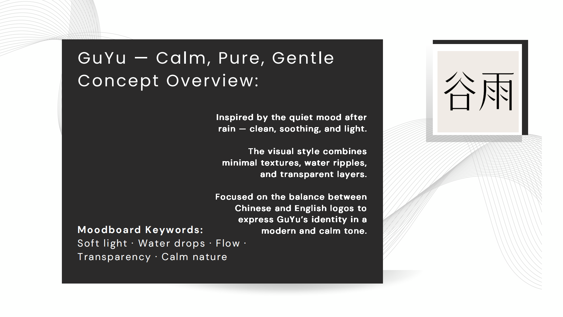 Focused on the balance between Chinese and English logos to express GuYu’s identity in a modern and calm tone. Soft light · Water drops · Flow · Transparency · Calm nature